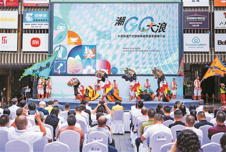 7月31日,大浪街道后浪新天地商圈人潮如织。随着国家级非遗——大船坑舞麒麟欢快跃动,大浪街道产文体旅商高质量发展推介会暨“潮GO大浪”文旅消费季启动仪式火热开启,正式拉开消费季序幕。