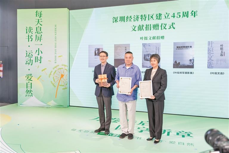 现场还举行了深圳经济特区建立45周年文献捐赠仪式。叶挺将军的后人——著名电影导演叶大鹰、叶挺纪念馆理事会荣誉副理事长叶小燕向深圳图书馆捐赠《叶挺家书里的家国情怀》《叶挺纪念文集》等。