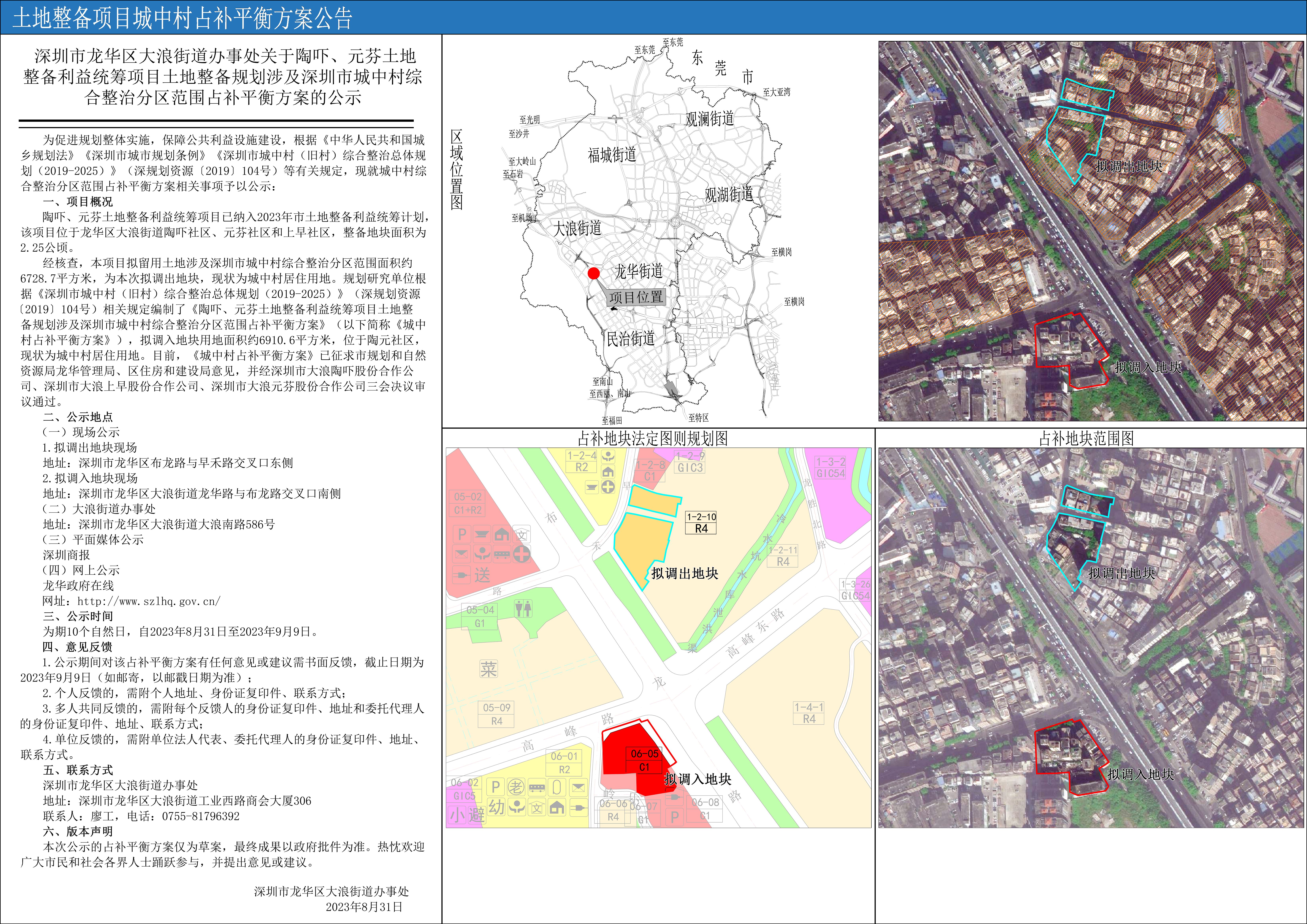 为促进规划整体实施,保障公共利益设施建设,根据《中华人民共和国城乡规划法》《深圳市城市规划条例》《深圳市城中村(旧村)综合整治总体规划(2019-2025)》(深规划资源〔2019〕104号)等有关规定,现就城中村综合整治分区范围占补平衡方案相关事项予以公示: