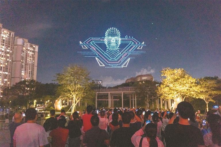 深圳北站中心公园内,早早聚集了前来观看无人机表演的市民群众,当无人机缓缓升起并在天空上幻化出各种图案时,市民惊叹声不断,并用手机记录下难忘的一瞬。