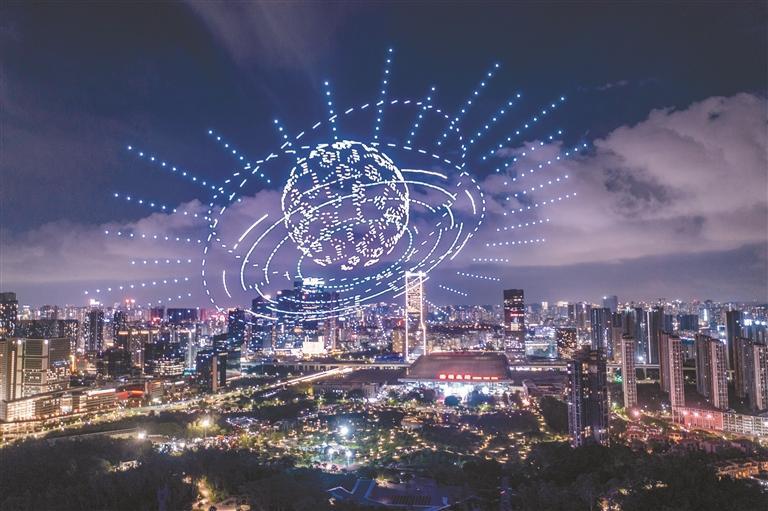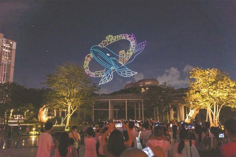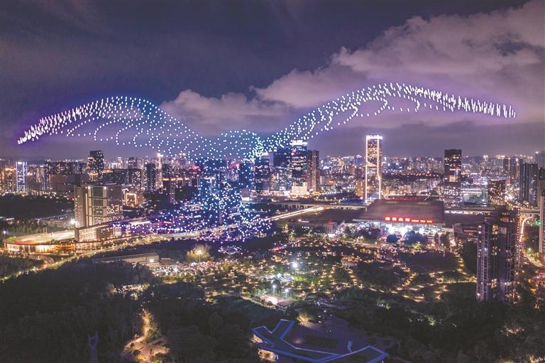 当晚,无人机方阵以“生命之源”“金色传说”“生意盎然”“奋斗未来”“星河璀璨”五个篇章共11幕画面生动展示了艺术与科技之美。