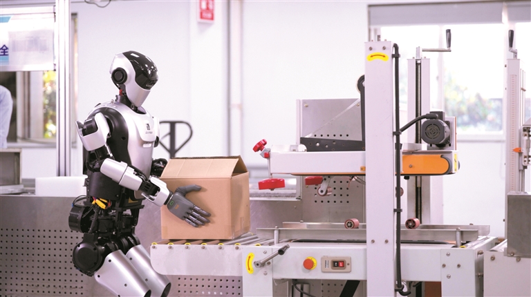 乐聚“夸父”人形机器人搭载盘古具身智能大模型后,在工业场景中进行封箱工作。